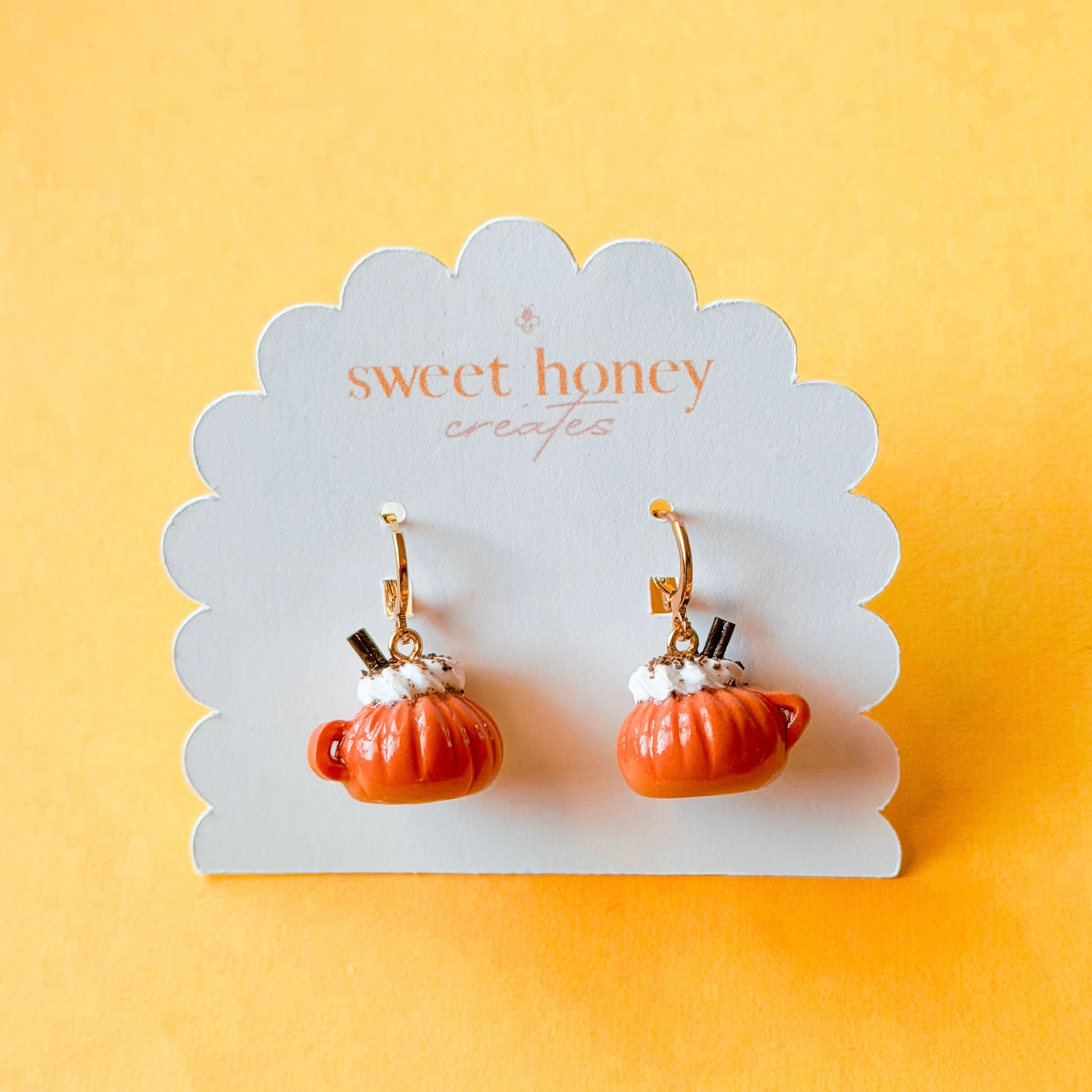 Enhance your look with these Pumpkin Spice Latte huggies! Handmade from polymer clay, they feature a delicate bow design for timeless charm. Ideal for any occasion, these versatile earrings add a touch of sophistication to any outfit, making them a perfect gift or personal indulgence.